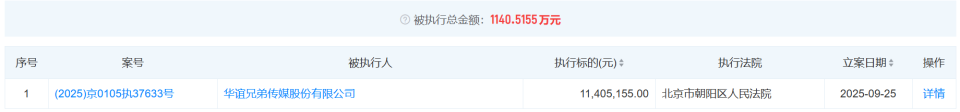 在电影小镇被全资收购不久后,9月25日,华谊兄弟新增一则被执行人信息。据天眼查APP,该执行标的1140万余元,执行法院为北京市朝阳区人民法院。