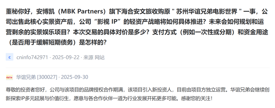 华谊兄弟仅回应称,公司与该项目的品牌授权合作期满,该项目引入新投资人,目前由项目方独立运营。华谊兄弟会继续创新探索IP多元延展与价值衍生,愿意与各合作伙伴一道为行业发展开拓更多可能。