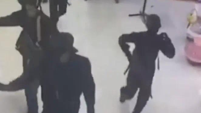 嫌犯分乘两辆皮卡车抵达商场,其中部分人留守车内,另一部分人持械闯入商场,制服保安后直奔金店实施抢劫。