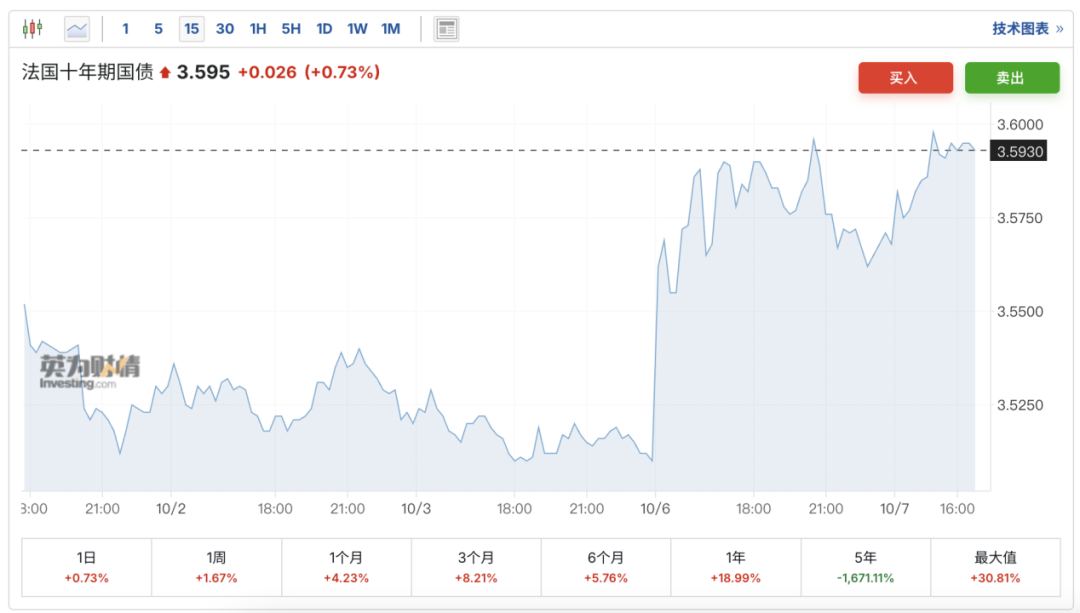 10月7日,法国国债市场再度遭遇猛烈抛售,法国十年期国债收益率一度升破3.6%,逼近2011年欧债危机期间的高位。