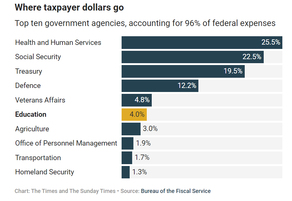 教育经费美国联邦支出的4.0%,在前十个政府机构中排名第六,不算靠后