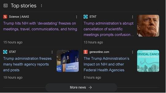 根据《华盛顿邮报》和《美联社》报道,特朗普政府命令NIH在2月1日前停止发布所有通讯,并取消演讲和出差等活动,任何例外需获得总统任命的人员批准。除了暂停通讯外,还包括叫停会议、冻结招聘等措施。虽然新政府上任时曾短暂暂停通讯,但此次暂停时间长达数周,前所未有。这种不确定性将对科学界,尤其是早期研究人员,造成严重影响。
