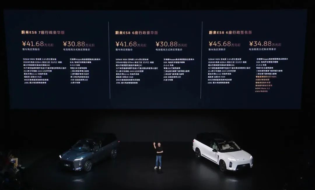 全新ES8共推出三个版本车型,分别为六座行政豪华版、六座行政签名版和七座行政豪华版。其中,六座和七座行政豪华版预售价相同,均为整车购买方案41.68万元起,电池租用方案30.88万元起;六座行政签名版整车购买方案的预售价为45.68万元起,电池租用方案预售价为34.88万元起。