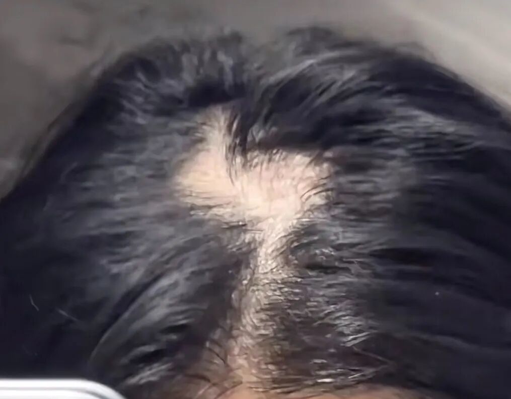 起初只是头顶局部的红肿发痒,然后就是脱屑,运动时会有明显的牵扯感,容易头痛。然后头顶局部就开始脱发,从一开始的小片,迅速进展成一发不可收拾的大片脱发,直到现在辛婷还没有长出新的头发。