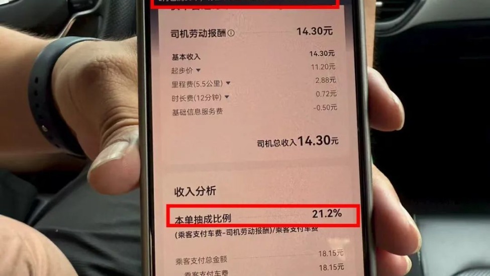 8月22日,记者在滴滴平台下单一辆网约车,支付车费18.15元,最终司机到手14.3元。按此折算,平台抽成比例为21.2%,抽成之外,平台另收取基础信息服务费0.5元。