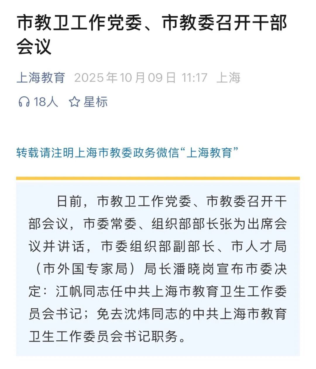 根据「上海教育」微信公众号 2025 年 10 月 9 日发布的信息,上海市委组织部副部长、市人才局(市外国专家局)局长潘晓岗宣布市委决定:江帆同志任中共上海市教育卫生工作委员会书记。