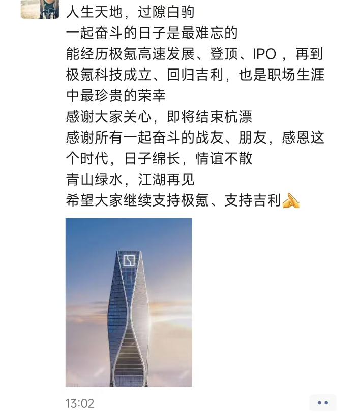 关海涛提到:“人生天地,过隙白驹。一起奋斗的日子是最难忘的,能经历极氪高速发展、登顶、IPO,再到极氪科技成立、回归吉利,也是职场生涯中最珍贵的荣幸。感谢大家关心,即将结束杭漂。感谢所有一起奋斗的战友、朋友,感恩这个时代,日子绵长,情谊不散。青山绿水,江湖再见。希望大家继续支持极氪、支持吉利。”
