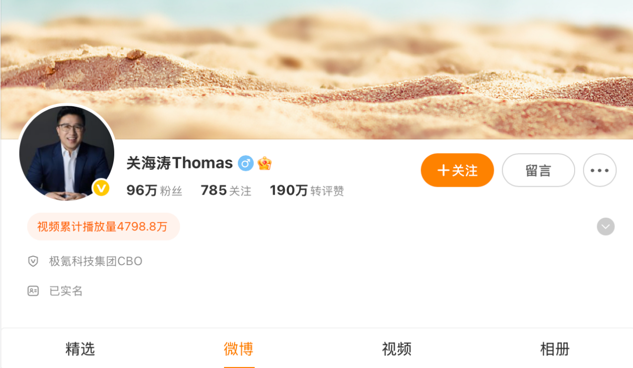 据悉,关海涛微博名称已从“极氪关海涛”更改为“关海涛 Thomas”,移除了“极氪”二字。关海涛最新一条微博为今年8月初发布,至今已停更2个月,其微博认证信息仍显示为“极氪科技集团CBO”,目前粉丝96万。