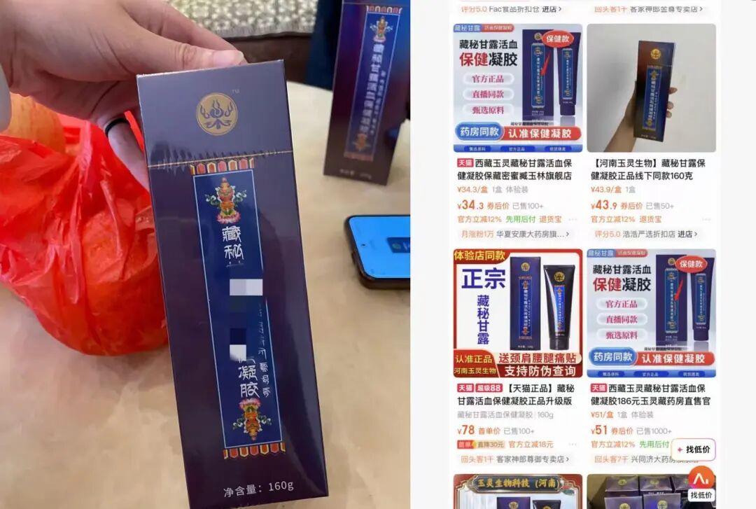 一位家属向记者展示老人购买的保健品,其中一种名为“西藏玉灵藏秘甘露活血保健凝胶”的产品在健康馆内购买190元,但电商平台仅售50元左右。此外,不少老人在健康馆内花数万元购买了理疗仪,但记者从多位理疗仪代理商处了解到,实际售价仅千元,拿货价则更低。
