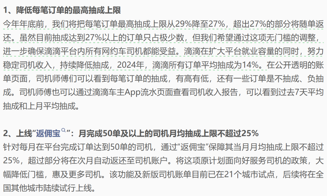 具体来看,滴滴宣布,今年年底前,将把每笔订单最高抽成上限从29%降至27%,超出27%的部分将随单返还。针对每月在平台完成订单达到50单的司机,通过“返佣宝”保障其当月月均抽成上限不超过25%,超过部分将在次月自动返还至司机账户。