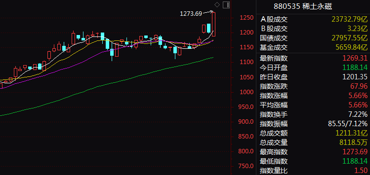 市场热点方面,有色金属概念再度全线走强,稀土永磁方向领涨,板块指数单边上扬,放量大涨5.66%,创历史新高。九菱科技一度冲击30%涨停,银河磁体、新莱福、惠城环保等多股20%涨停,包钢股份、北方稀土、中国稀土等逾20只个股涨停或涨超10%。
