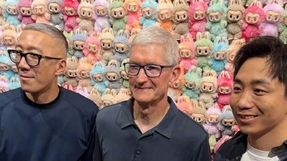 2025年10月13日,苹果CEO蒂姆·库克现身上海,参加LABUBU巡展,与泡泡玛特创始人、董事长兼CEO王宁以及LABUBU之父龙家升合影。