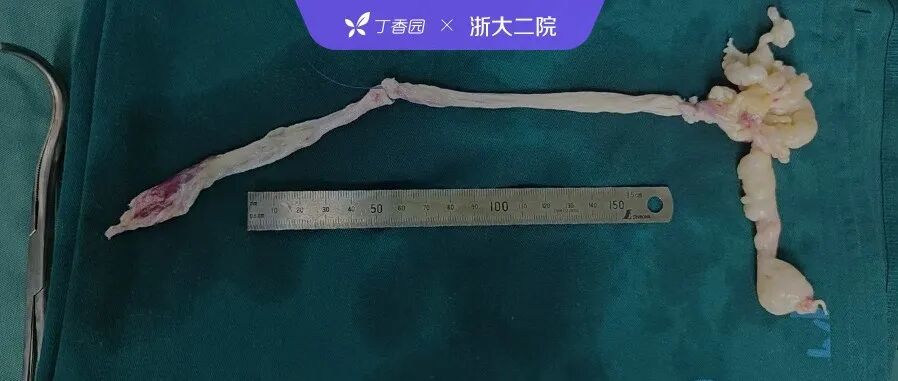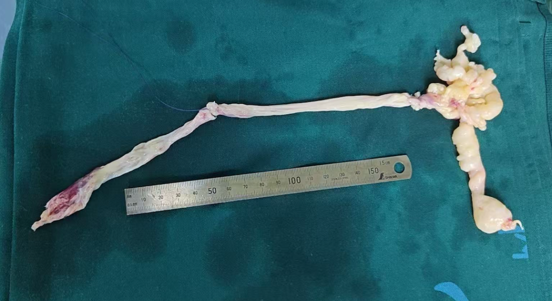 当治疗团队将从心脏出取出的上半段,与从下腔静脉处取出的下半段合在一起时,发现仅二期手术取出的瘤体,总长就已经超过 20cm。