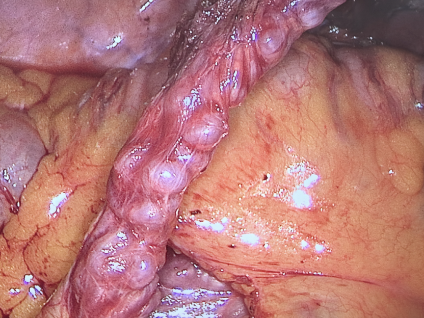 全麻后,腹腔镜下可见患者的子宫右前壁有一直径 2cm 的肌瘤样凸起,左侧宫旁隆起,表面是丰富迂曲的血管,与此同时,左侧卵巢血管也呈串珠样改变,左侧盆侧壁与乙状结肠局部致密粘连。