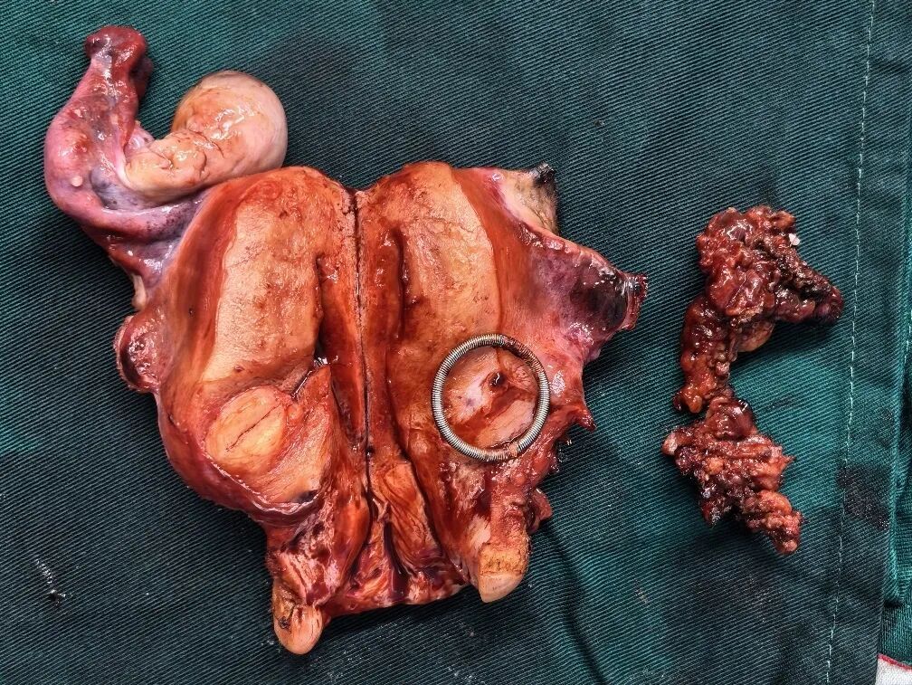 但手术到这里仍未结束。进一步环形切断阴道壁后,子宫及双附件被整体切除。经阴道取出后,可见子宫右前壁有一直径 3cm 的肌瘤,子宫左后壁也有质软肌瘤样组织。
