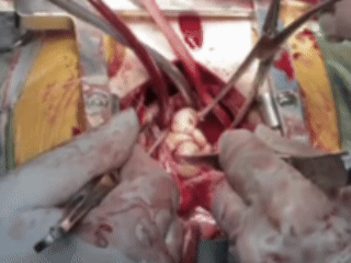 常规建立体外循环后,经患者股静脉插管,并阻断上腔静脉,随后打开右心房,可见肿瘤几乎填满了右心房、右心室。临时松开腹部下腔静脉的阻断钳后,一颗形状怪异的平滑肌瘤,被完整地从心脏内「扯」了出来。