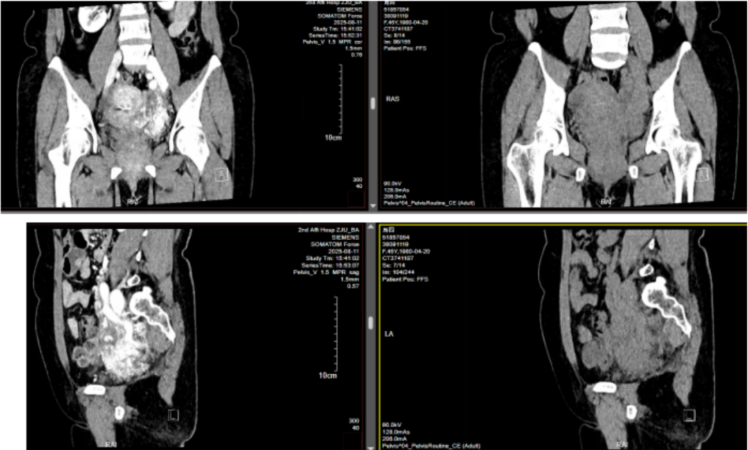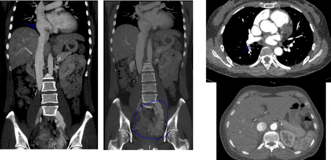 考虑到患者为女性,45 岁正是围绝经期,并且患者表示自己近 2 月有月经不规律的情况,因此又补充了妇科影像学检查。其中的盆腔增强 CT 显示,患者子宫多发肌瘤,右侧附件区囊肿,盆腔左侧血管曲张,左髂静脉、下腔静脉可疑充盈缺损。