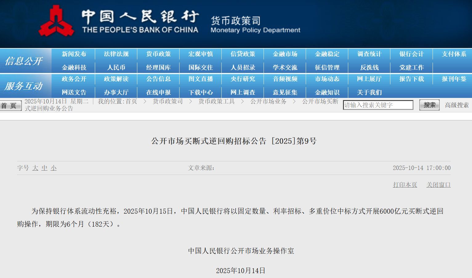 10月14日,央行在官网发布公告称,2025年10月15日,中国人民银行将以固定数量、利率招标、多重价位中标方式开展6000亿元买断式逆回购操作,期限为6个月(182天)。
