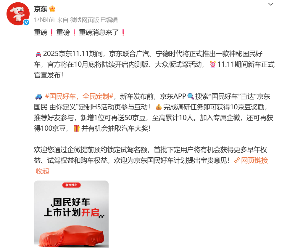 10月14日,京东官方微博发布消息称,2025京东“11·11”期间,京东联合广汽、宁德时代将正式推出一款神秘“国民好车”,将在10月底陆续开启内测版、大众版试驾活动。