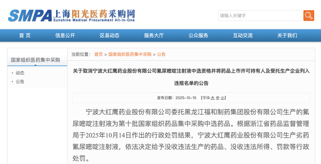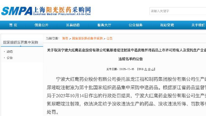 10 月 15 日,上海阳光医药采购网发布《关于取消宁波大红鹰药业股份有限公司氟尿嘧啶注射液中选资格并将药品上市许可持有人及受托生产企业列入违规名单的公告》。