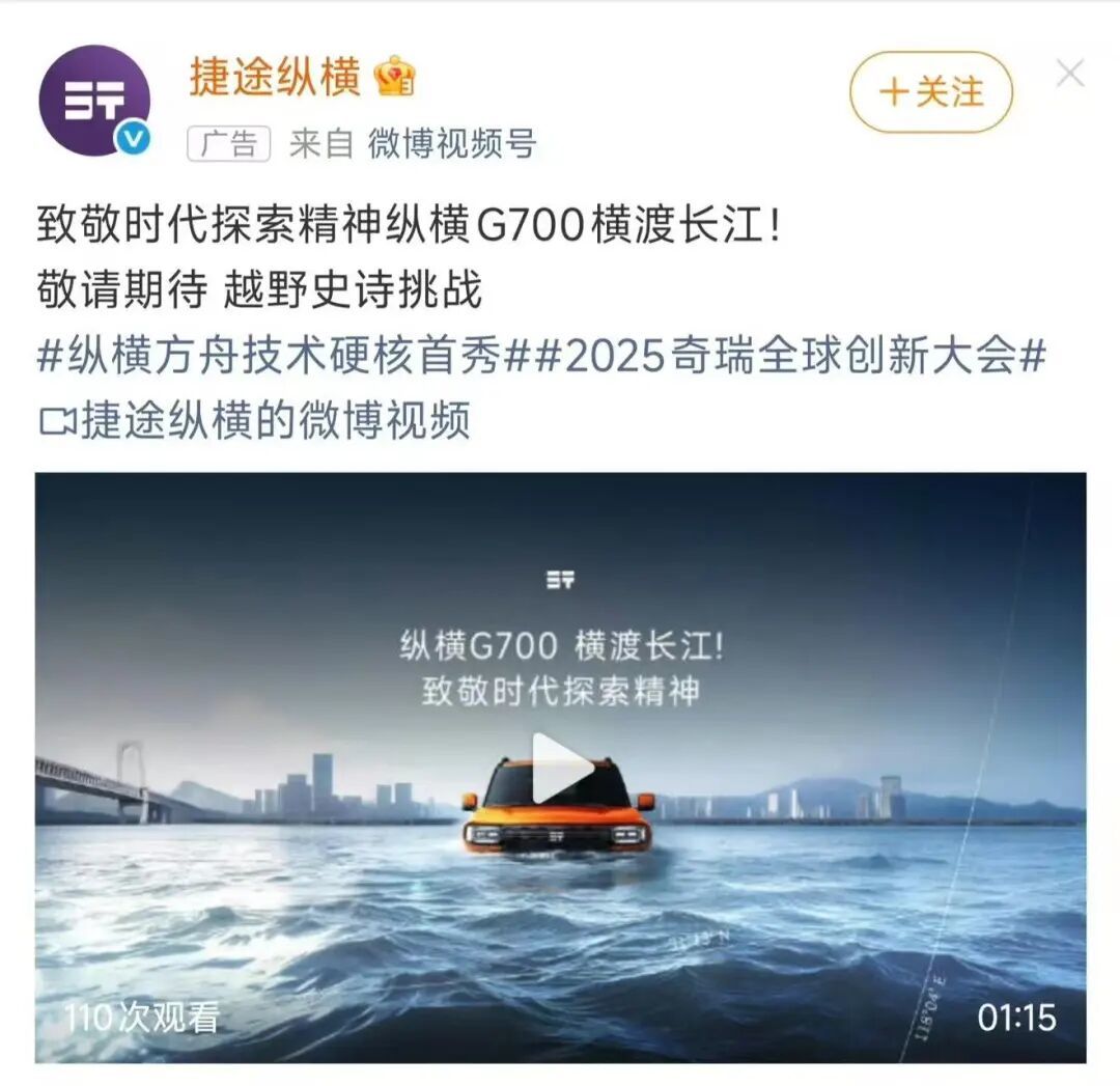 奇瑞旗下有个品牌捷途纵横,做了波营销,发起了横渡长江的挑战。