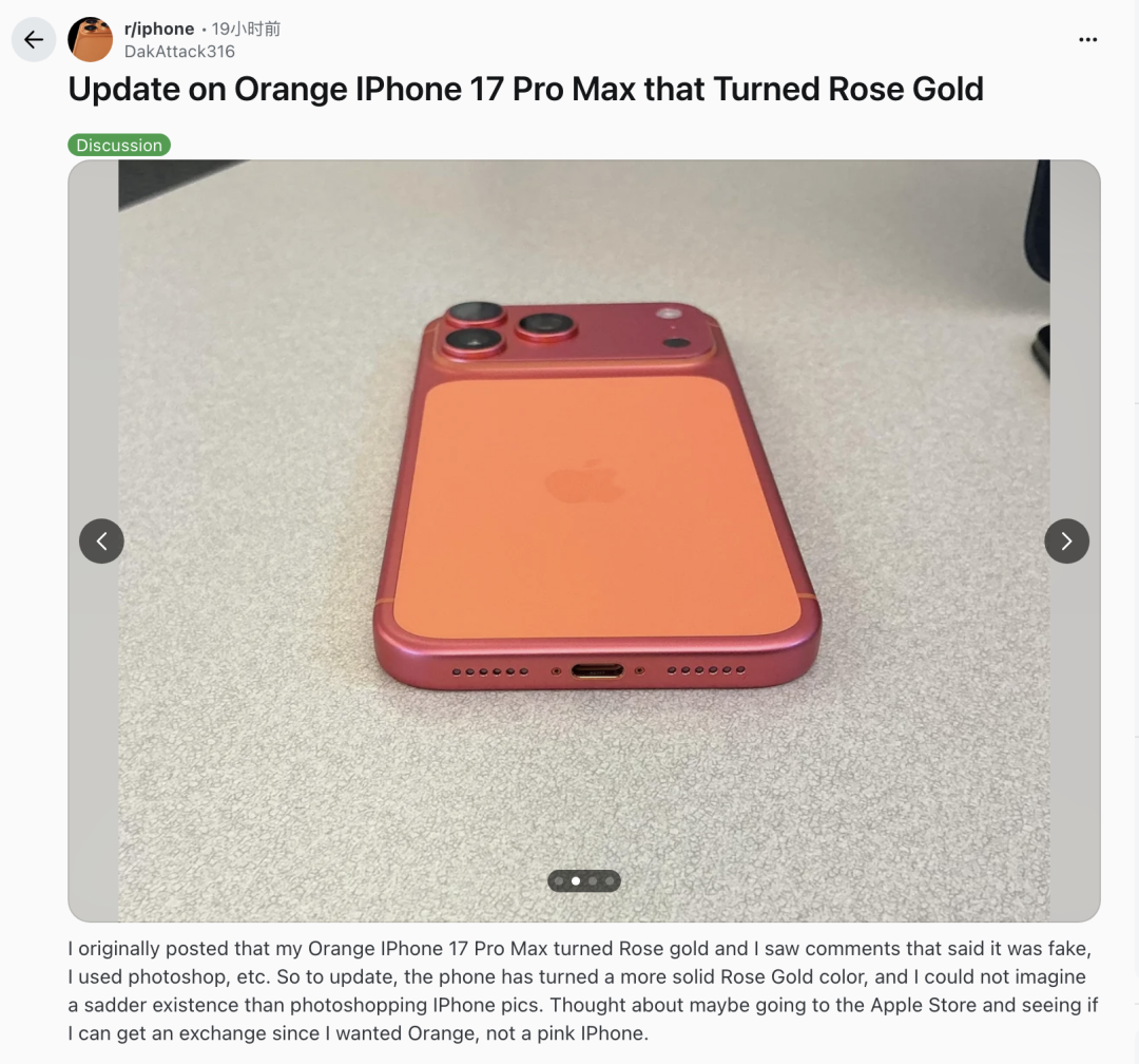 至于这位 Reddit 用户的情况,他表示将联系苹果售后,希望更换一台全新的 iPhone 17 Pro Max。他强调,自己购买的本就是星语橙配色,而非如今变成的玫瑰金色版本。