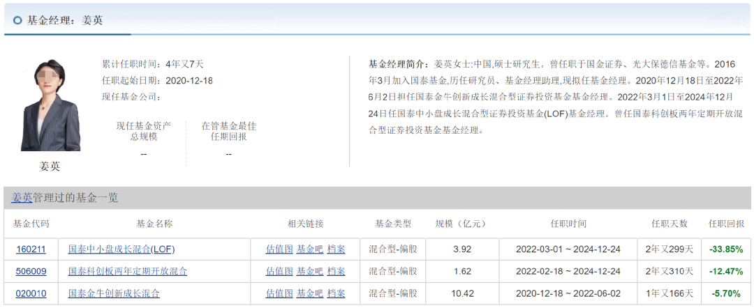 更让人惊讶的是,姜英管理期间,有两只基金创下了阶段最差业绩表现。2022年3月22日至2024年7月3日,她单独管理的国泰中小盘成长任期回报为-28.64%,系阶段最差表现;2022年2月18日至2024年12月23日,与樊利安共同管理的国泰科创板两年定开任期回报为-12.47%,同样创下最差业绩记录。