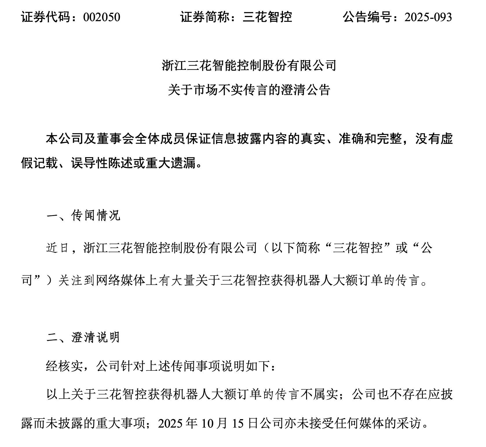 10月15日,三花智控(002050.SZ)公告称,近日关注到网络媒体上有大量关于公司获得机器人大额订单的传言,经核实,该传言不属实;公司也不存在应披露而未披露的重大事项;2025年10月15日公司亦未接受任何媒体的采访。