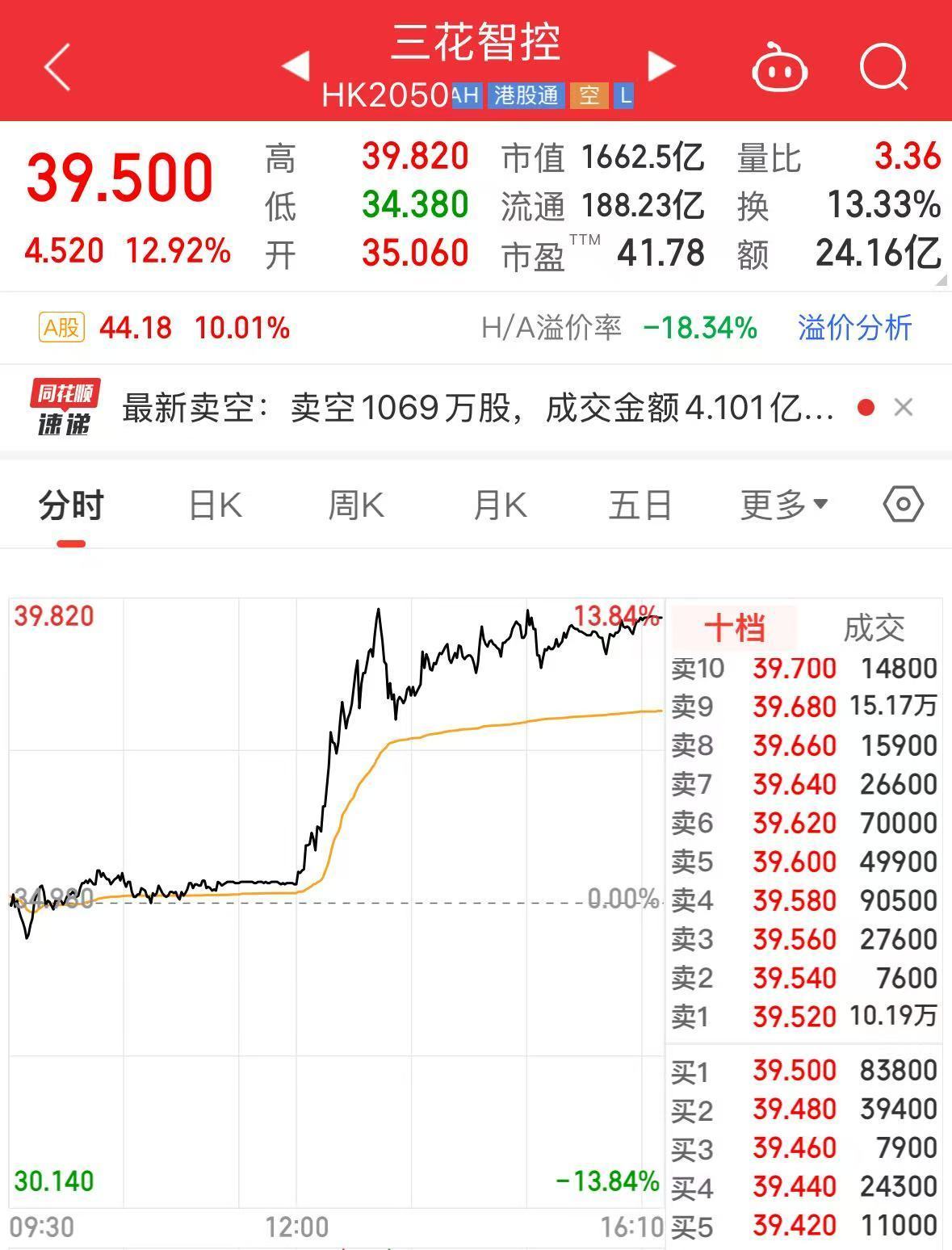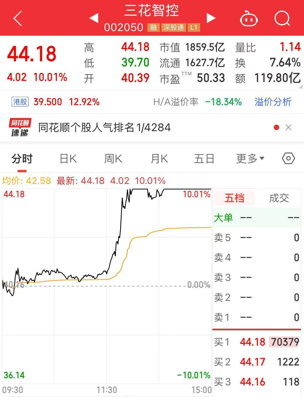 10月15日午后,三花智控A股直线拉升,盘中触及涨停。与此同时,三花智控港股也同步拉升,盘中一度涨超13%。