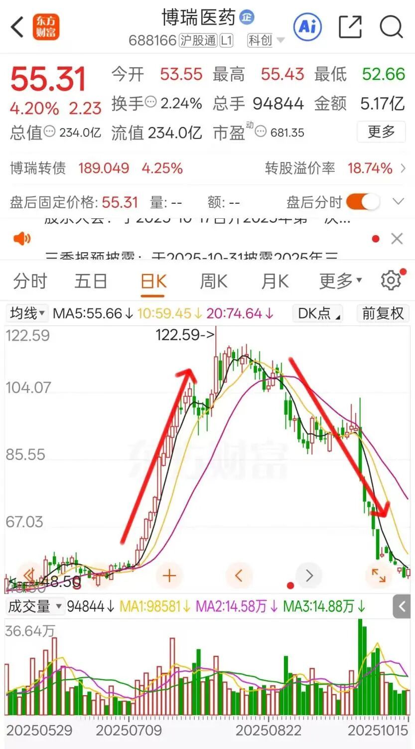 尤其是从7月11日开始之后的一个月,其股价更是快速上涨,短短一个月从55元最高涨到120元附近,8月中旬开始又持续暴跌,目前最新股价跌到了55.31元。短短三个月,博瑞医药股价就坐了一轮大大的“过山车”。