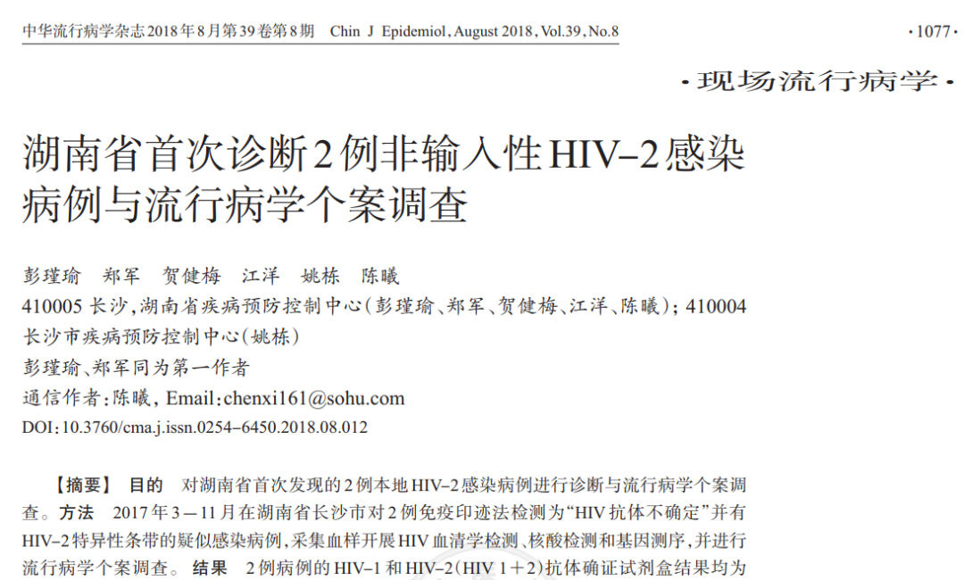 2017 年湖南省报告了 2 例非输入性 HIV-2 感染病例,这是国内首次本土 HIV-2 病例报告。随后湖南省在 2005~2019 年保存的既往 HIV-2 血清学抗体检测可疑样本中,检出 HIV-2 核酸阳性 13 例。