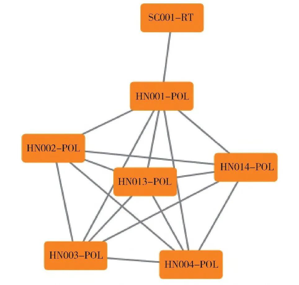 利用软件绘制样本的分子传播网络图,显示本病例与湖南省提供的 6 条已确证 HIV-2 的样本序列形成了 1 个传播网络(簇),且病例与 HN001 相互连接。