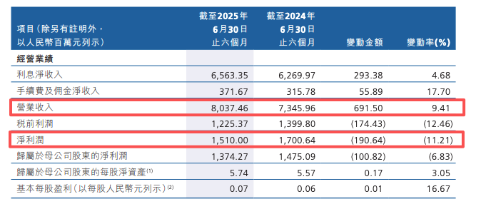 广州农商行8月底发布的2025年中期业绩报告显示,上半年该行实现营业收入80.37亿元,同比增长了9.41%,扭转了近三年来连续下滑的态势;然而净利润却未能同步增长,同比下滑11.21%,仅为15.10亿元,呈现出明显的“增收不增利”格局。