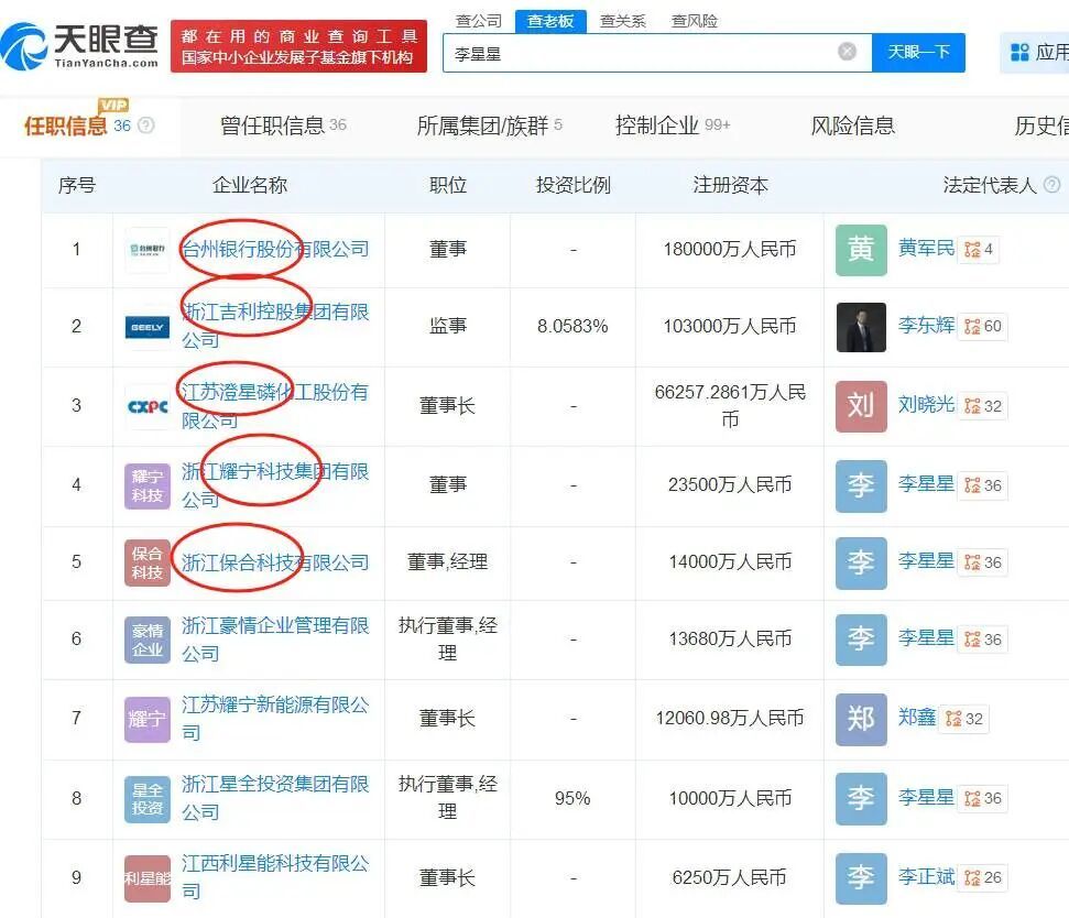 此外,李星星通过宁波梅山保税港区昂步投资、杭州朗马投资等37家企业构建起投资矩阵,重点布局新能源与半导体领域,形成”实体产业+金融资本”的庞大商业版图。