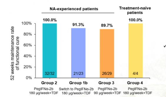 在 52 周延长随访(即完成治疗后停药 76 周)时[10],组 2 中已治愈患者的临床治愈状态维持率高达 100%(图 3)。