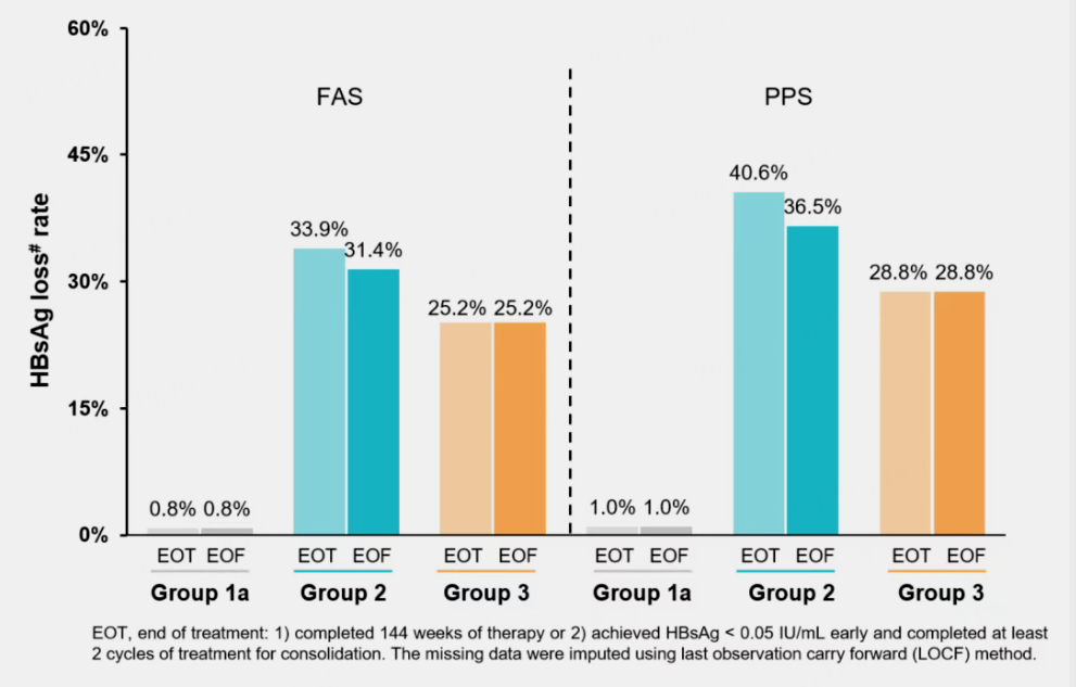 图 2 NA 经治患者在 EOT 和 EOF 时的 HBsAg 清除率(PegIFNα-2b 和 TDF 均停药)
