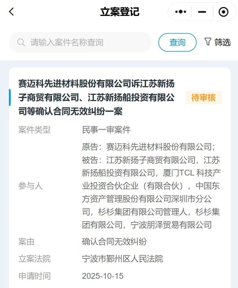 据杉杉股份9月底公告披露,重整投资人联合体包括任元林控制的扬子江金控旗下江苏新扬子商贸以及扬子江系公司“江苏新扬船投资”、TCL产投和东方资管深圳分公司,当中并无赛迈科的名字。