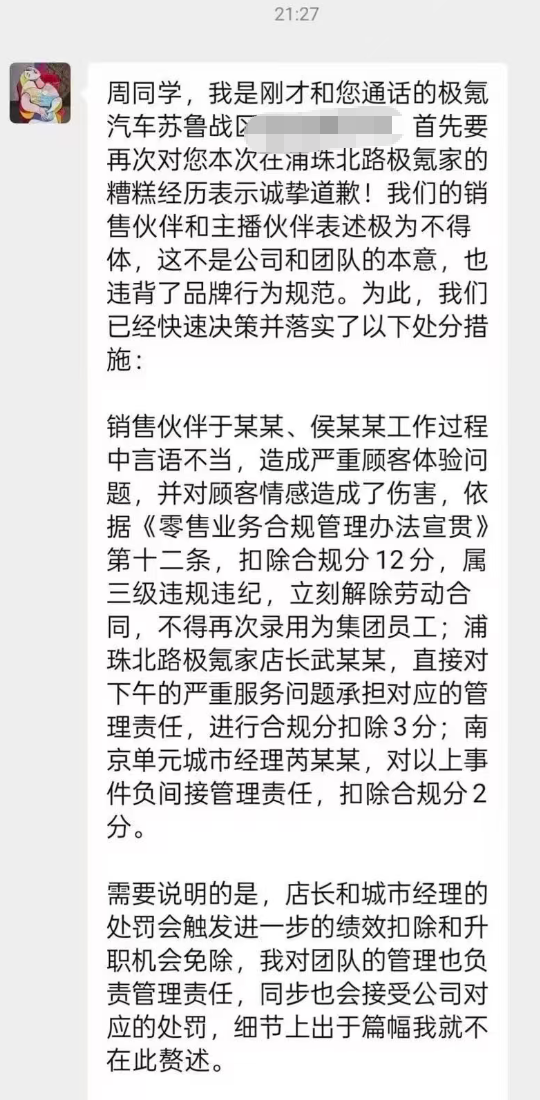 我们的销售伙伴和主播伙伴表述极为不得体,这不是公司和团队的本意,也违背了品牌行为规范。为此,我们已经快速决策并落实了以下处分措施:销售伙伴于某某、侯某某工作过程中言语不当,造成严重顾客体验问题,并对顾客情感造成了伤害,依据《零售业务合规管理办法宣贯》第十二条,扣除合规分12分,属三级违规违纪,立刻解除劳动合同,不得再次录用为集团员工:浦珠北路极氨家店长武某某,直接对下午的严重服务问题承担对应的管理责任,进行合规分扣除3分;南京单元城市经理芮某某,对以上事件负间接管理责任,扣除合规分2分。