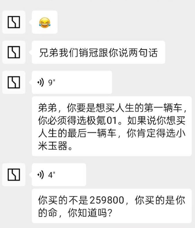 该销售回复:兄弟我们销冠跟你说两句话。销冠发语音称:“弟弟,你要是想买人生的第一辆车你必须得选极氪01。如果说你想买人生的最后一辆车,你肯定得选小米YU7。你买的不是259800,你买的是你的命,你知道吗?”