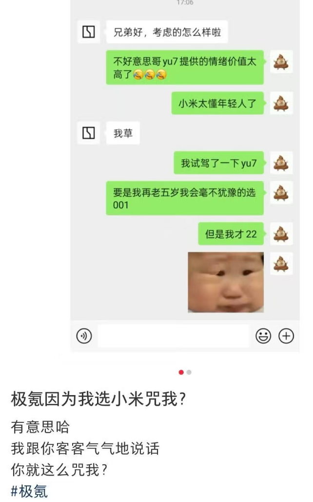 DoNews10月21日消息,20日,有用户在社交平台发贴称,因为选择购买小米汽车,被极氪销售“诅咒”,该销售称“如果说你想买人生的最后一辆车,你肯定得选小米YU7”。