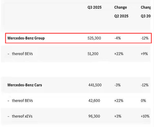 官方数据显示,奔驰集团第三季度全球销量为52.53万辆,同比下滑12%;