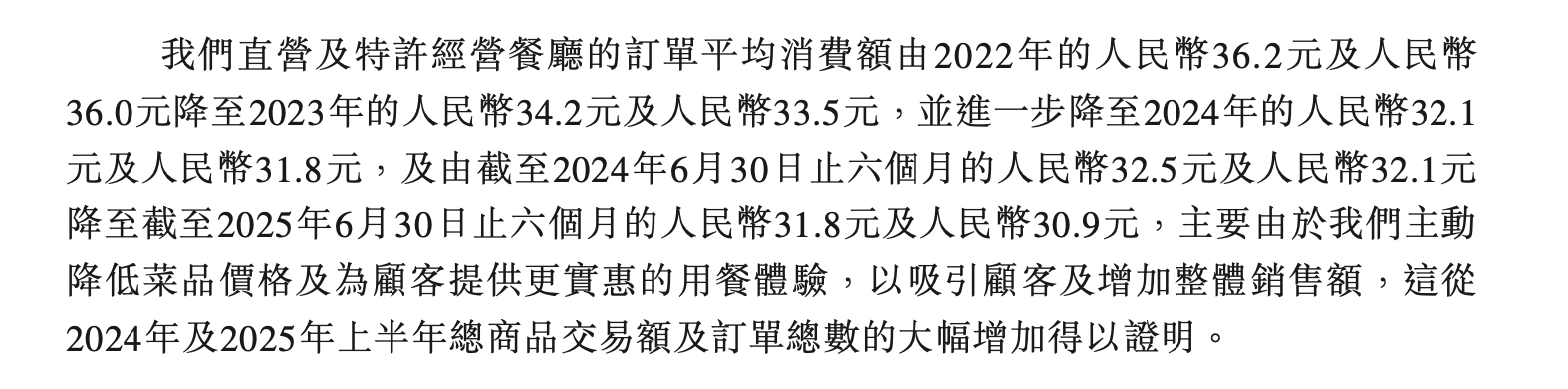 为应对竞争,遇见小面选择了“以价换量”。其招股书显示,直营与特许经营餐厅的客单价已从2022年的36元左右,一路降至2025年上半年的31元左右。