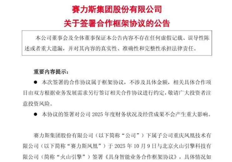 今年10月9日,赛力斯发布公告称:公司与字节跳动旗下的火山引擎达成合作,赛力斯的第二成长曲线由此进入大众视野。