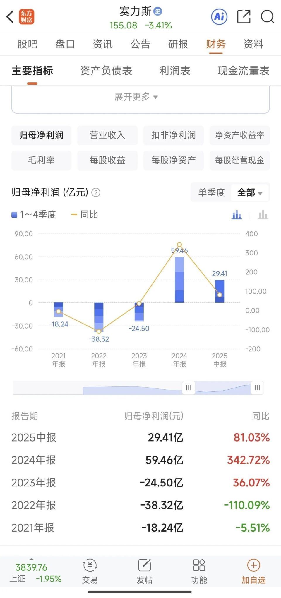 今年上半年,赛力斯的归母净利润为29.41亿元,同比增长81.03%,在A股汽车领域位增速位居榜首。