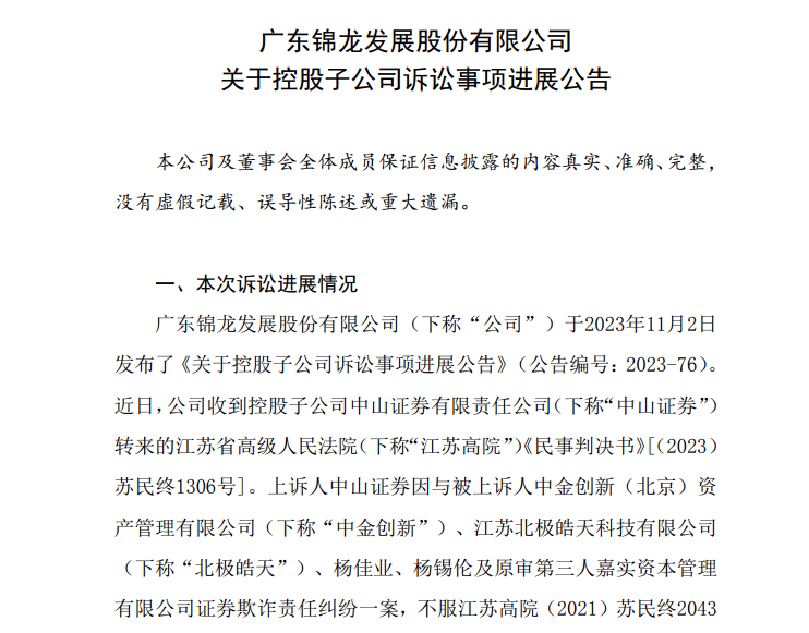 10日23日晚间,锦龙股份发布控股子公司诉讼事项进展公告,其控股子公司中山证券与中金创新、北极皓天等主体的证券欺诈责任纠纷案迎来终审,中山证券在30%范围内与北极皓天承担连带赔偿责任。