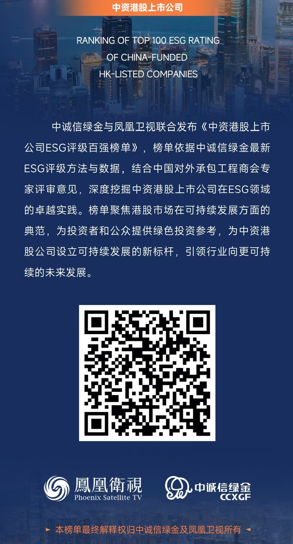 凤凰卫视与中诚信绿金连续第三年联合发布《中资港股上市公司ESG评级百强榜单》,旨在全面回顾和展示2024年度中资港股上市公司在环境保护、社会责任与公司治理(ESG)方面的整体表现。本次榜单力求呈现中资港股企业在可持续发展领域的真实图景与突出成果。