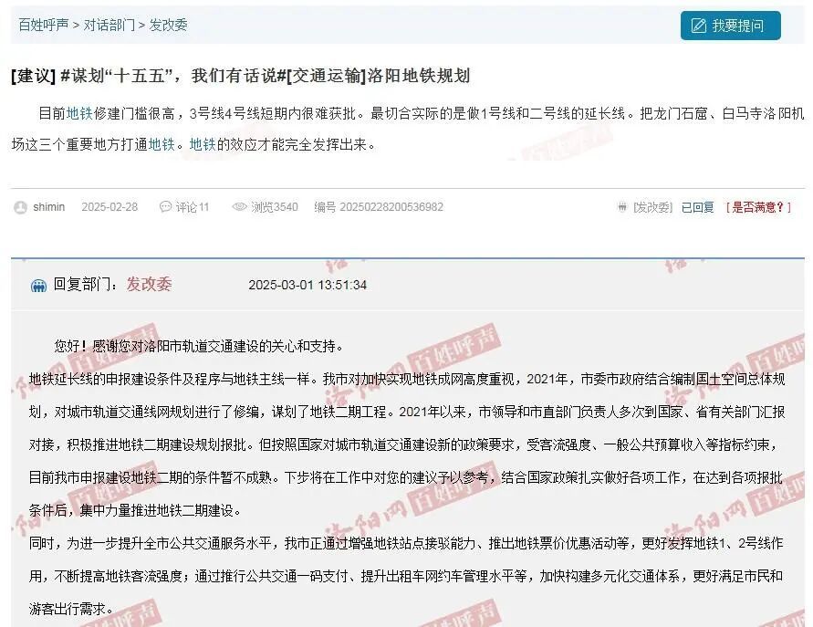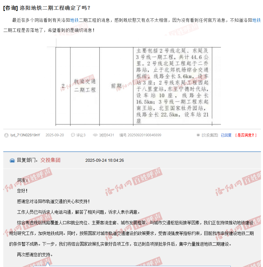 近日,有洛阳市民在洛阳交投官网咨询地铁二期进展情况。