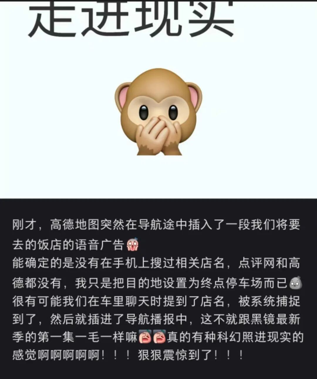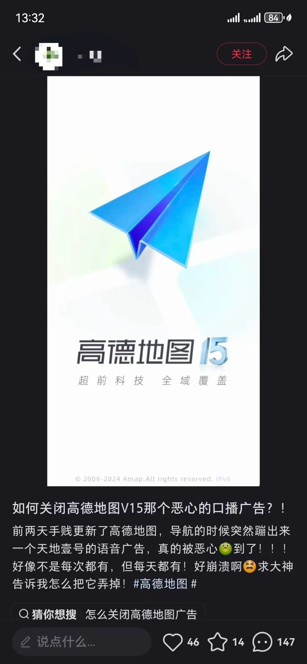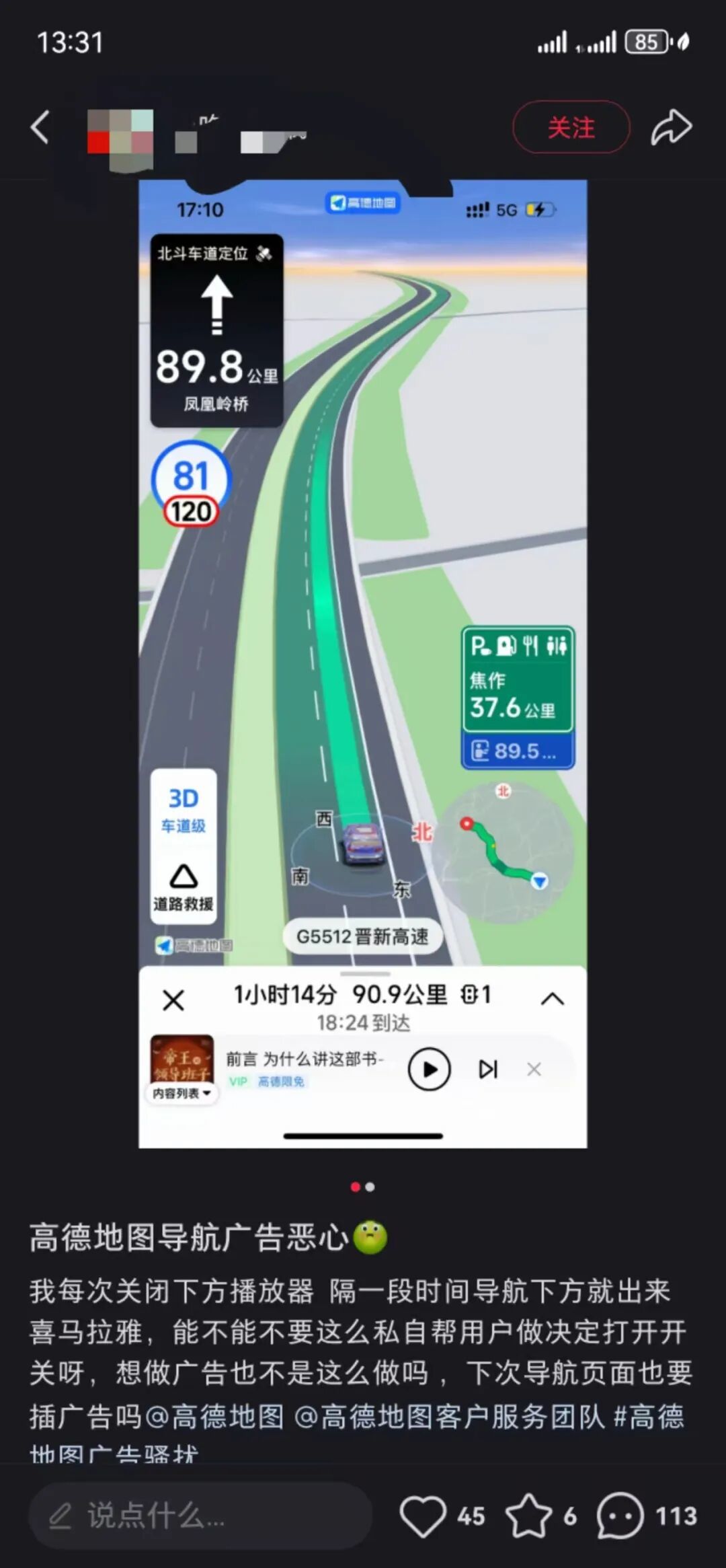 还有网友称,使用高德导航时候突然会有语音广告,虽然不是每次导航都有,但是每天都有,感觉很崩溃;