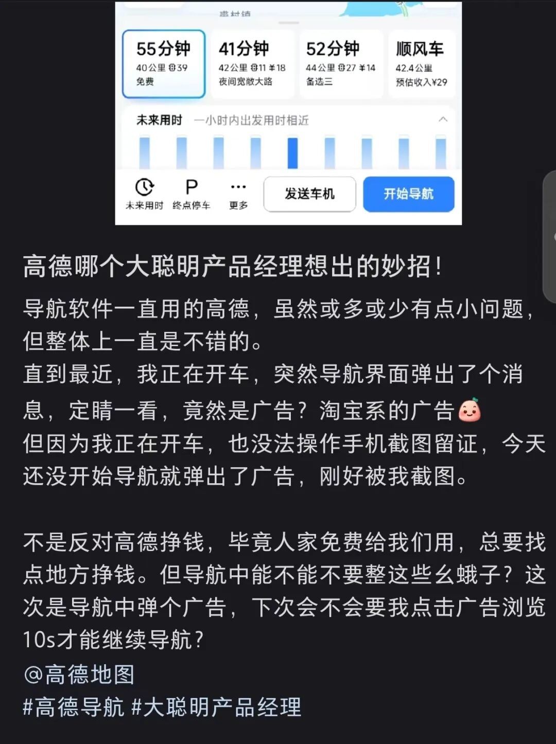 三言发现,在社交平台上近期也有不少网友吐槽高德地图的广告植入问题。