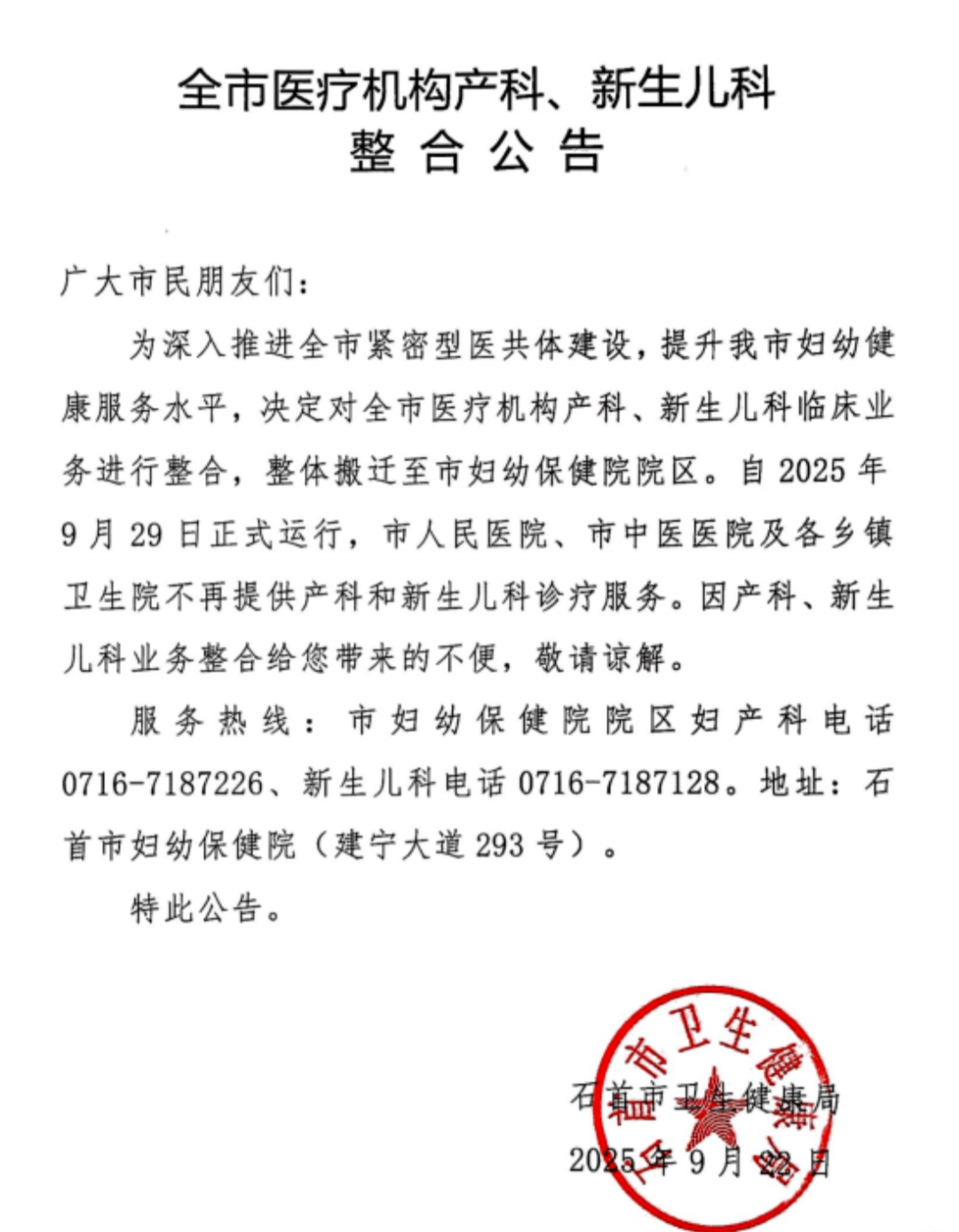 石首市卫生健康局发布公告称:决定对全市医疗机构产科、新生儿科临床业务进行整合,整体搬迁至市妇幼保健院院区,市人民医院、市中医医院及各乡镇卫生院不再提供产科和新生儿科诊疗服务。[1]